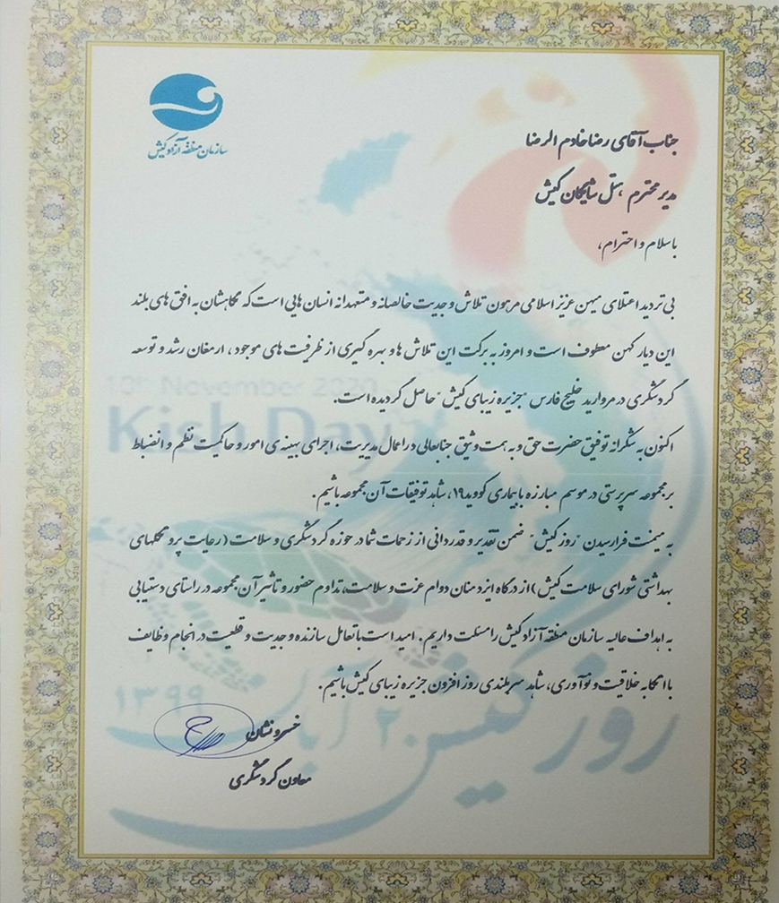 معاون گردشگری منطقه آزاد کیش به مناسبت ۲۰ آبان ، روز کیش از عملکرد هتل شایگان کیش در رعایت پروتکل های بهداشتی مبارزه با کرونا تقدیر و تشکر کرد.